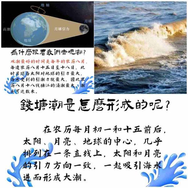 到觀潮現場去見見,古往今來文人墨客筆下的涌潮,一線潮、交叉潮、回頭潮,不同種類的潮有什么區別渾厚的浪潮在洶涌的咆哮,想要將答案一一告訴孩子們。
