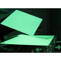 夜光板是用高亮夜光粉與PVC樹脂材料混合后制作完成,是種硬質的發光板材,可以切割成不同的規格,可以在表面進行絲網印刷,制作成各種蓄光自發光導向標示系統。目前這種板主要出口到歐美等市場,制作的消防標示符合歐盟標準。材料具有一定的阻燃性能。