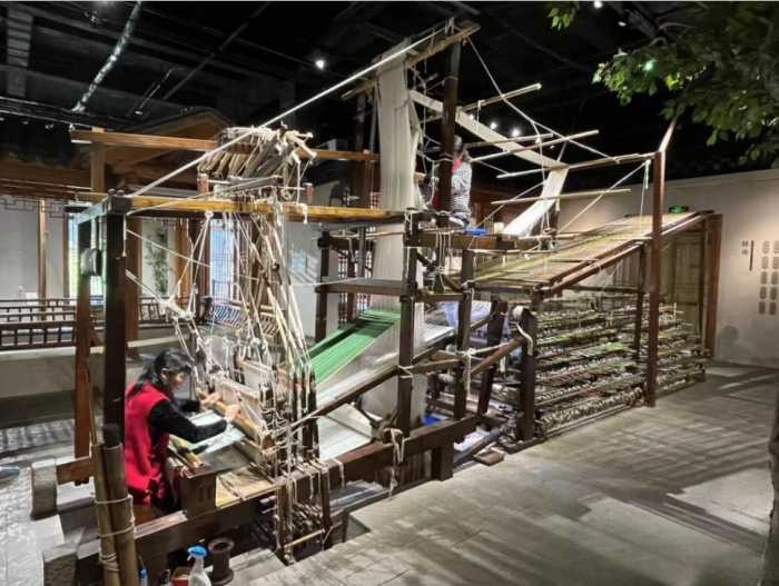穿過中庭,步入織染坊,兩臺巨大的織機立于大廳中央,幾位工匠正忙碌地操作著。上前詢問后才了解,原來眼前就是代表中國最高織造技藝的宋錦小花樓織機和五彩漳緞大花樓織機,這兩臺機器也是絲綢博物館最大的亮點。