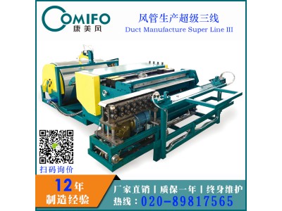 風管生產超級三線包含電動料架,調平壓筋,沖方口,沖尖角,折邊,剪切,升降雌口轆骨機(升降轆骨機1 型)機。可實現剪切,聯合角成型,提高生產效率。能與法蘭成型機,折邊機等配套使用。采用全電腦PLC 控制,觸摸屏操作,可根據操作要求設置任意尺寸進行下料,該生產線最大加工速度為18 米/ 分,精度為:長度誤差±0.5mm,對角線誤差為±0.5mm, 標準開料架承重5 噸,可根據客戶要求配套。