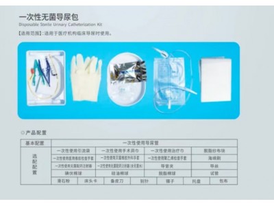 結構及組成 本產品由基本配置一次性使用導尿管和選配配置一次性使用引流袋、一次性使用手術洞巾、一次性使用治療巾、脫脂紗布塊、鑷子、一次性使用橡膠檢查手套、一次性使用滅菌橡膠外科手套、一次性使用聚乙烯檢查手套、一次性使用無菌配藥注射器、一次性使用無菌配藥注射器(含無菌水)、碘伏棉球、硅油棉球、脫脂棉球、備皮刀、海綿刷、別針、試管、導管夾、導絲、滑石粉、床頭卡、托盤、包布組成。