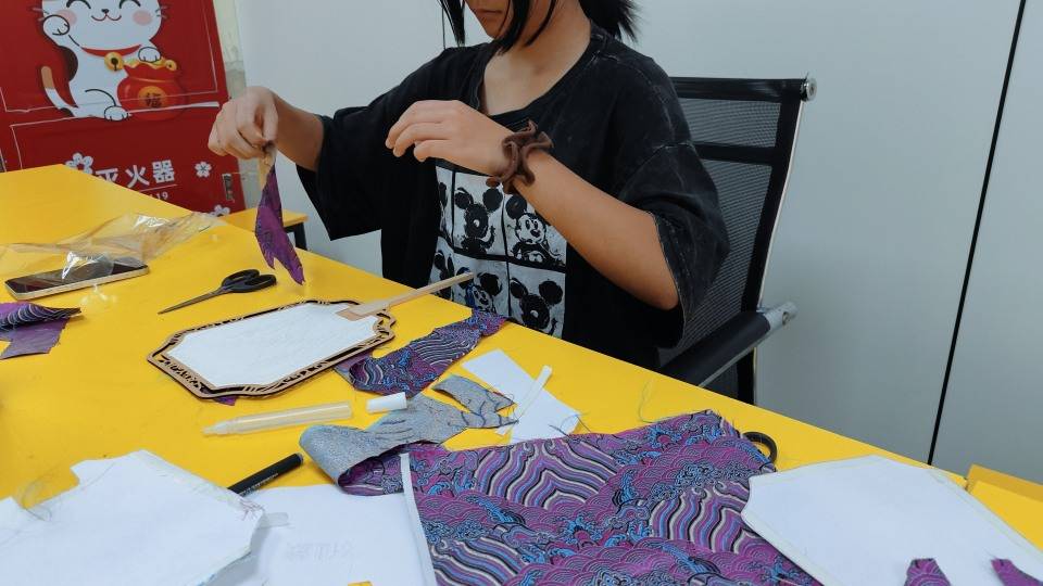 粘貼扇面:薄涂膠水于扇框,對齊宋錦輕柔貼合,注意避免膠漬外溢。